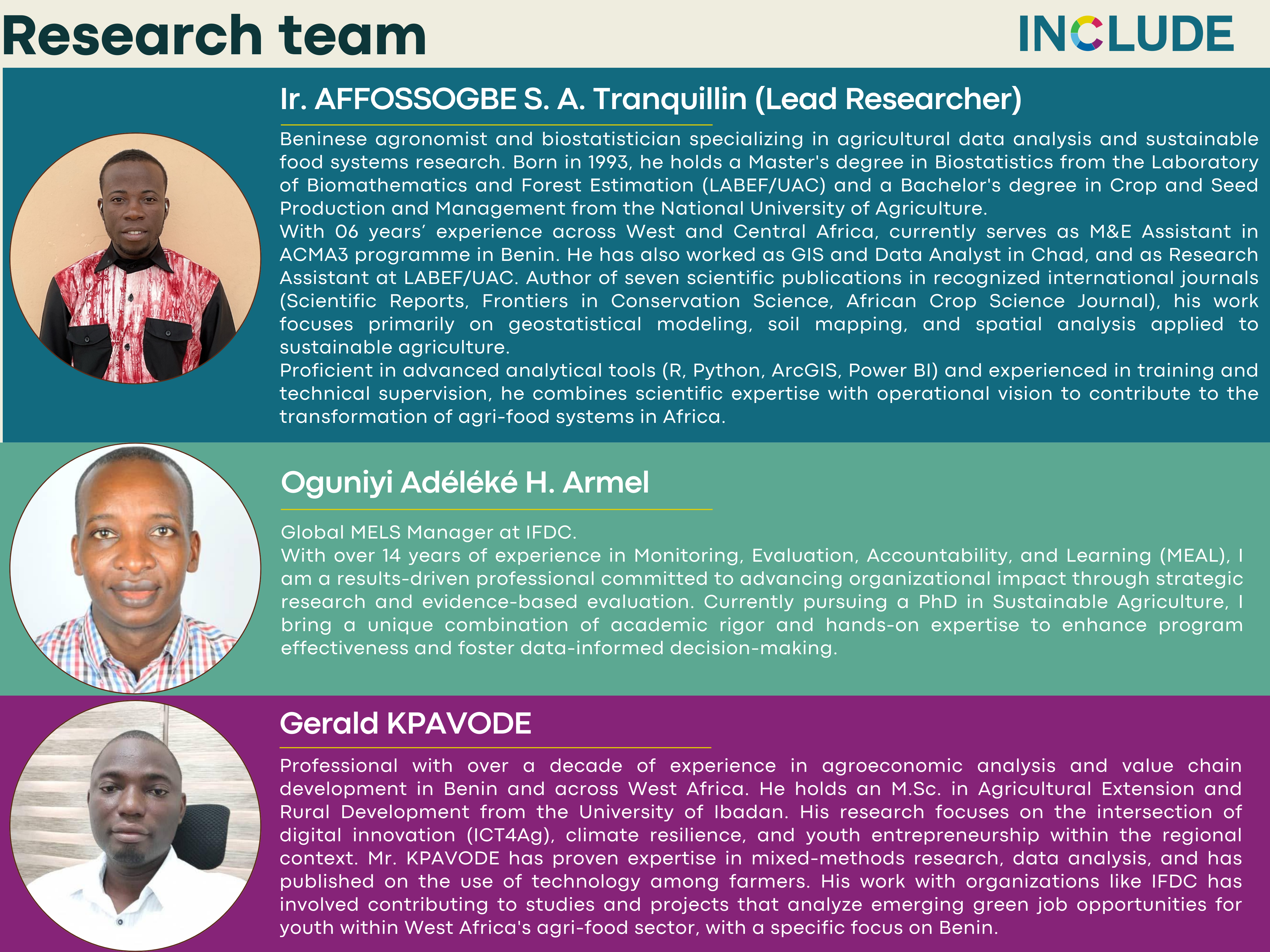 The project Mapping Employment Opportunities for Youth in Emerging Agri-Food Value Chains in Benin explores how three emerging value chains—organic market gardening, sustainable agro-processing, and digital marketing—can create meaningful employment for young people. To this end, a total of 383 youth aged 18 to 35 from the states of Atlantique, Borgou, and Couffo will be surveyed, representing 40% women and 60% men. Their perspectives are complemented by 32 key informants, including policymakers, academic researchers, youth organizations, and support structures, alongside geospatial mapping across six strategic communes.