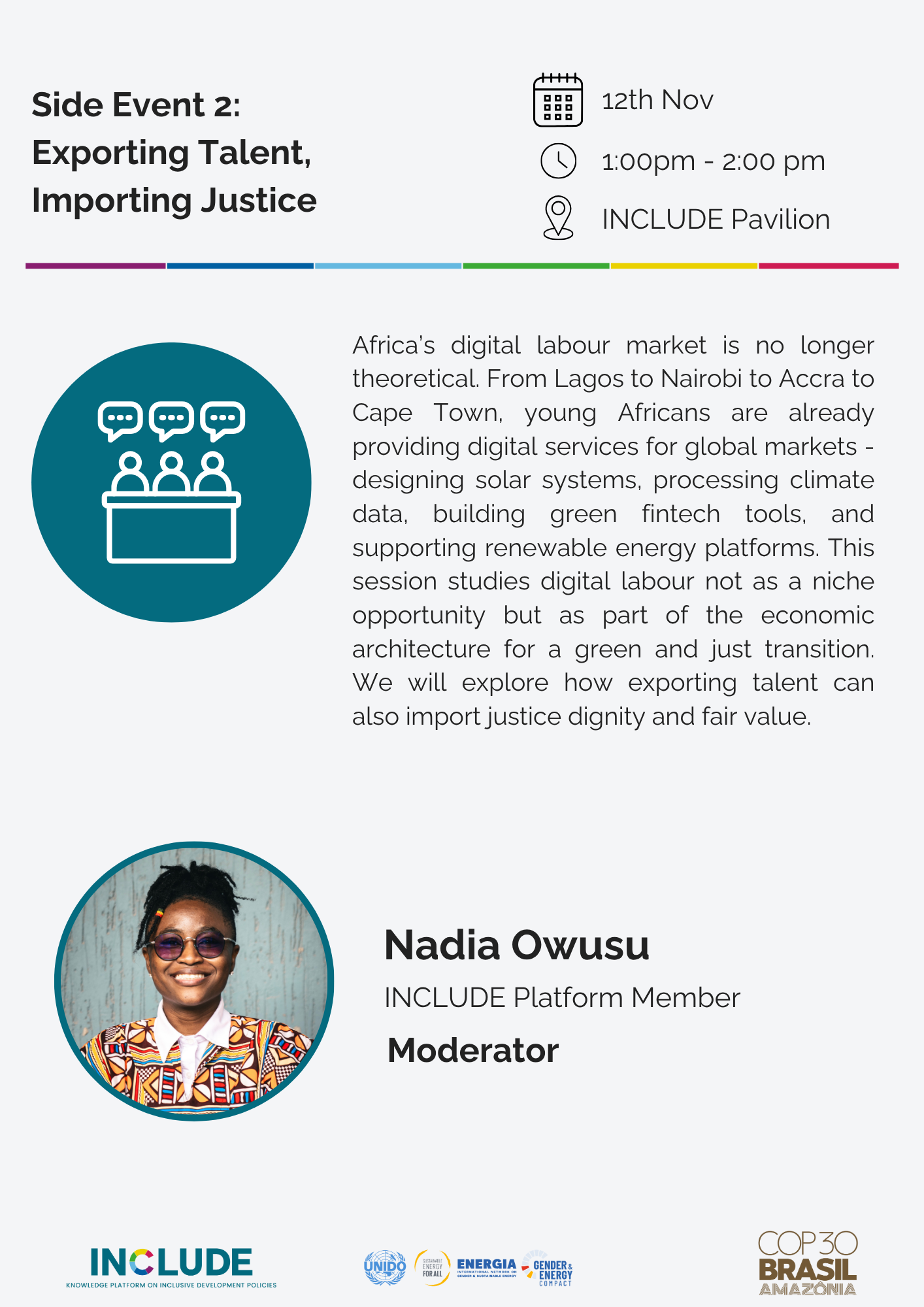 On 12 November at the INCLUDE Pavilion we go straight into one of the most strategic issues in the African green transition today. Digital labour is expanding and global demand for digital services is rising. The question is not if Africa has talent. The question is how Africa will capture value fairly. This session studies digital labour not as a niche opportunity but as part of the economic architecture for a green and just transition. We will explore how exporting talent can also import justice dignity and fair value.