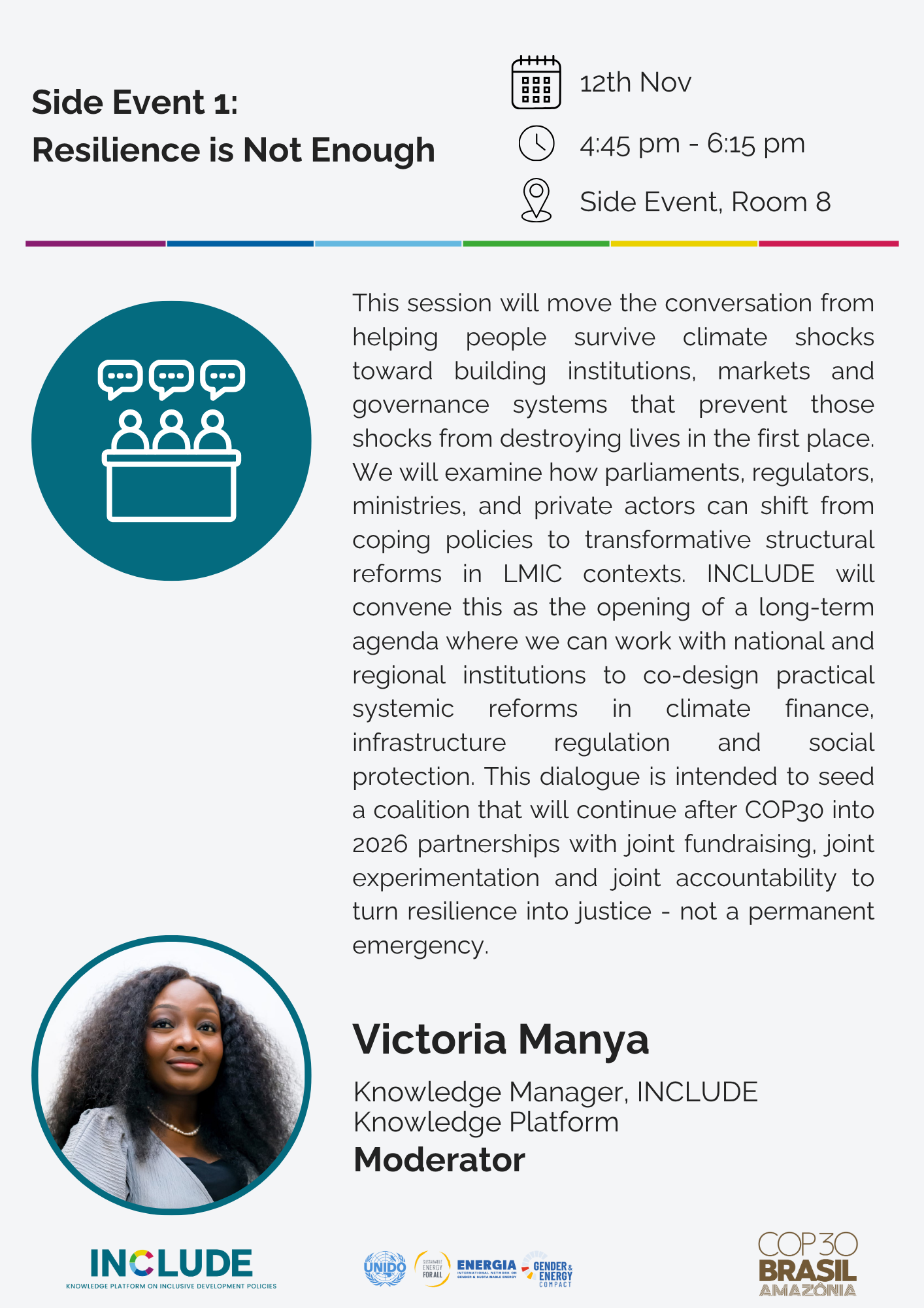 Africa is entering a decisive decade for climate action. At COP30 INCLUDE will convene a series of conversations inside the Blue Zone that are grounded in African experience and African agency. The purpose of these sessions is not to celebrate resilience but to challenge the conditions that make resilience necessary. Each event brings leaders who are shaping policy markets regulation and talent development on the continent. The goal is to hold focused honest discussions on what Africa must do now in order to turn climate policy into real transformation for people.