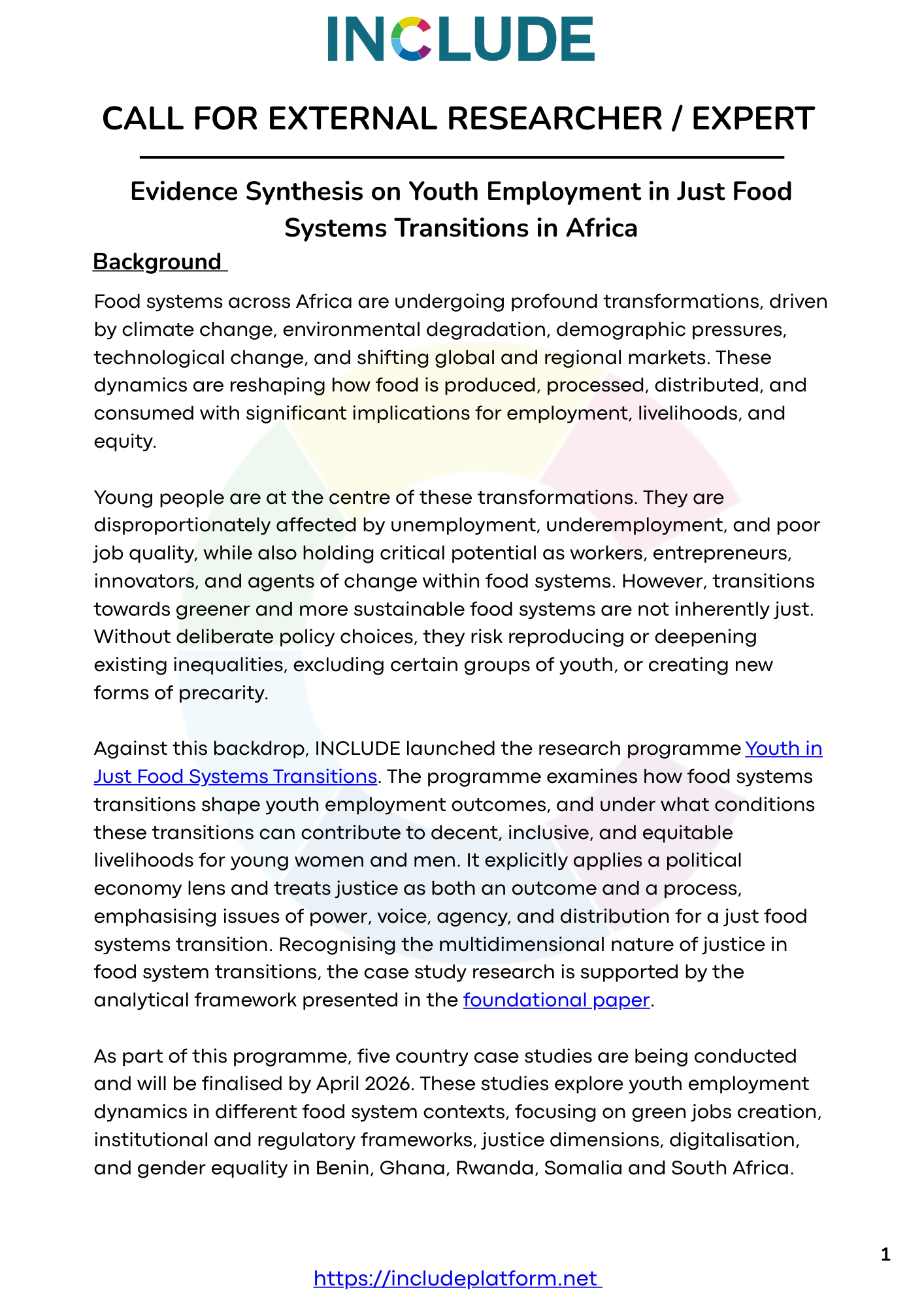 As part of its research programme Youth in Just Food Systems Transitions, INCLUDE invites external researchers or research teams to develop an Evidence Synthesis Paper (ESP) that brings together insights from the five country case studies that are currently being conducted in Benin, Ghana, Rwanda, Somalia, and South Africa. The synthesis will focus on how different food systems transformation pathways affect youth, and under what conditions these transitions can contribute to decent, inclusive, and just livelihoods for young women and men.