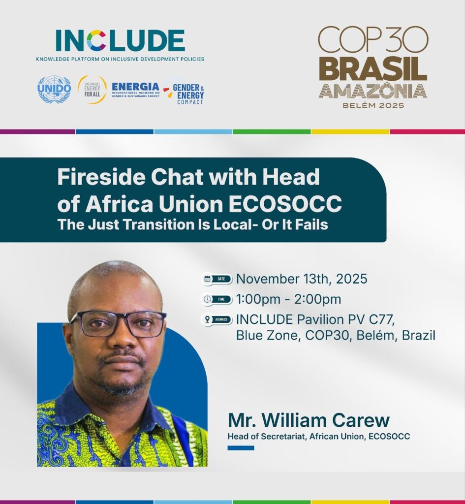 Join us for this thought-provoking fireside chat hosted by INCLUDE, ENERGIA, Sustainable energy for all, Global Women’s Network for the Energy Transition, UNIDO, and the Gender and Energy Compact, where we’ll explore how local governance, community innovation, and regional collaboration are shaping Africa’s leadership in the global climate transition.